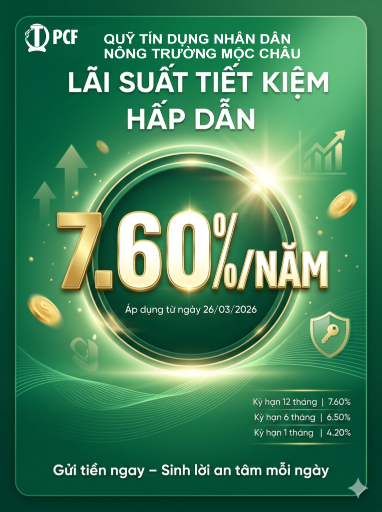 Quỹ TDND Nông Trường Mộc Châu kính gửi Quý khách hàng thông báo lãi suất tiền gửi tiết kiệm từ ngày 26/3/2026